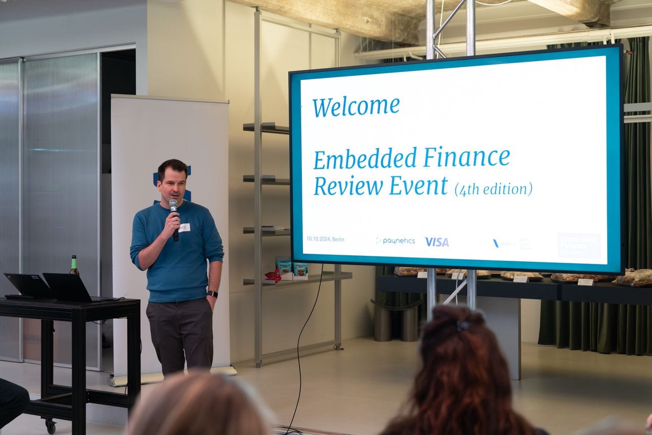 A big thanks to our two sponsors, Paynetics and Visa, for their support and insightful presentations. I kicked things off with a short intro to embedded financing, using my new embedded finance slide deck. After that, each of our sponsors came on stage for their presentations. Unfortunately, our third speaker, Christian Steiger from Lexware Office, had to cancel his trip to Berlin at the last minute.