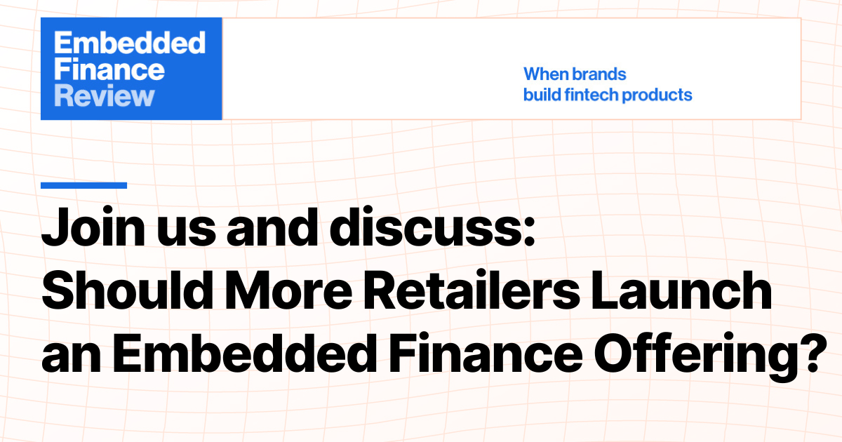 I am hosting my first virtual event. You might remember my survey from a few weeks ago, where I asked you what topic you thought was suitable. The majority voted for a vertical in Embedded Finance. After some thinking, I opted for retailers in Embedded Finance, as it is a constant topic within the ecosystem, with multiple new launches and failures in the past few months. Even more importantly, the topic allows for a great debate where we can discuss the question from two sides.