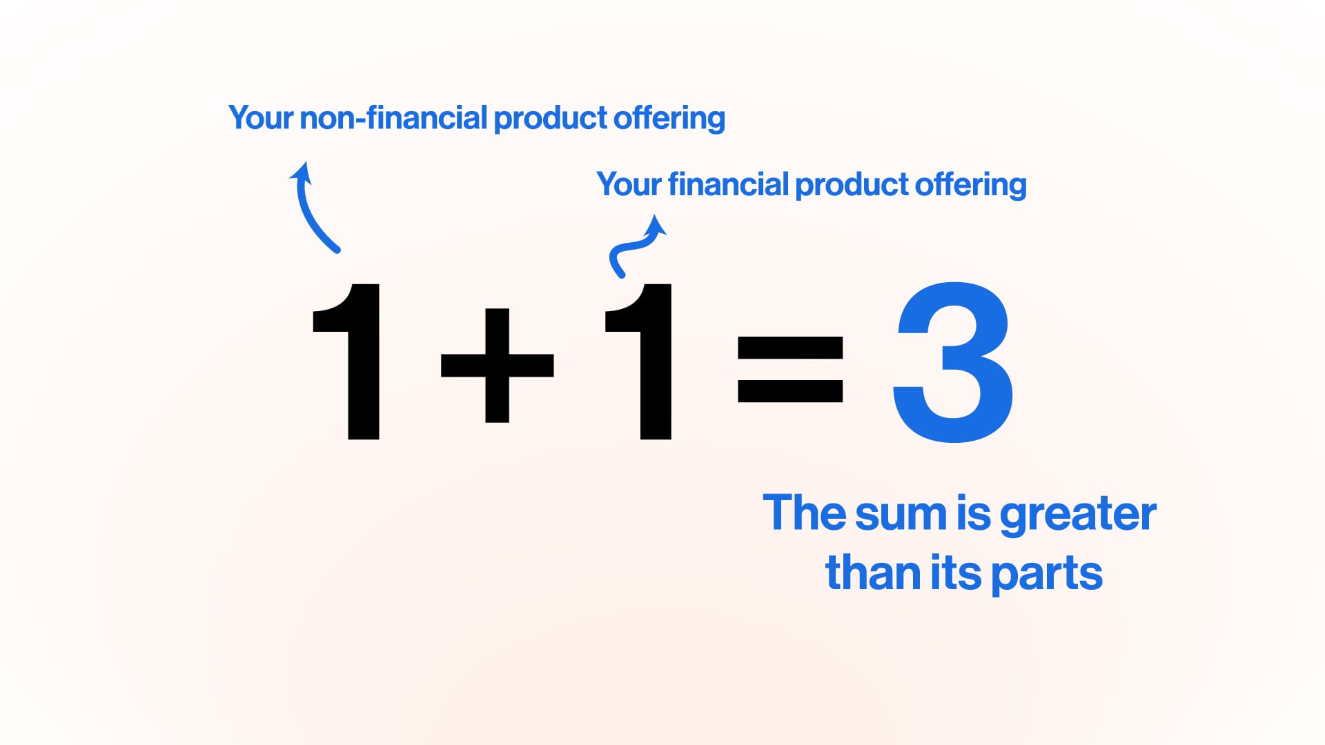 The best Embedded Finance products are not financial and non-financial products offered next to each other but ‘one’ product. The equation in the image below explains this. When a non-financial brand embeds a financial product (customer value of 1) into a non-financial product (customer value of 1), the combined customer value of the two products (3) should be greater than the sum of its parts.